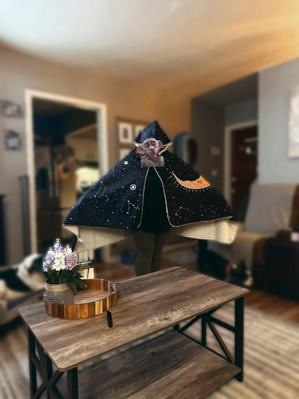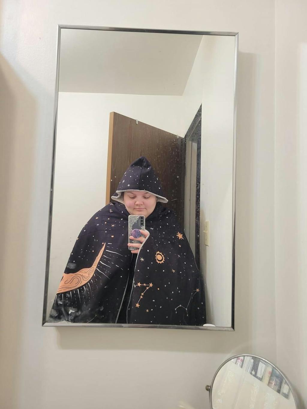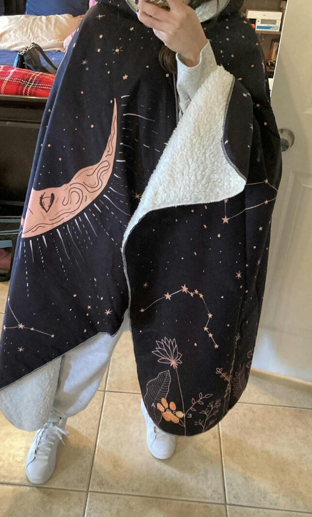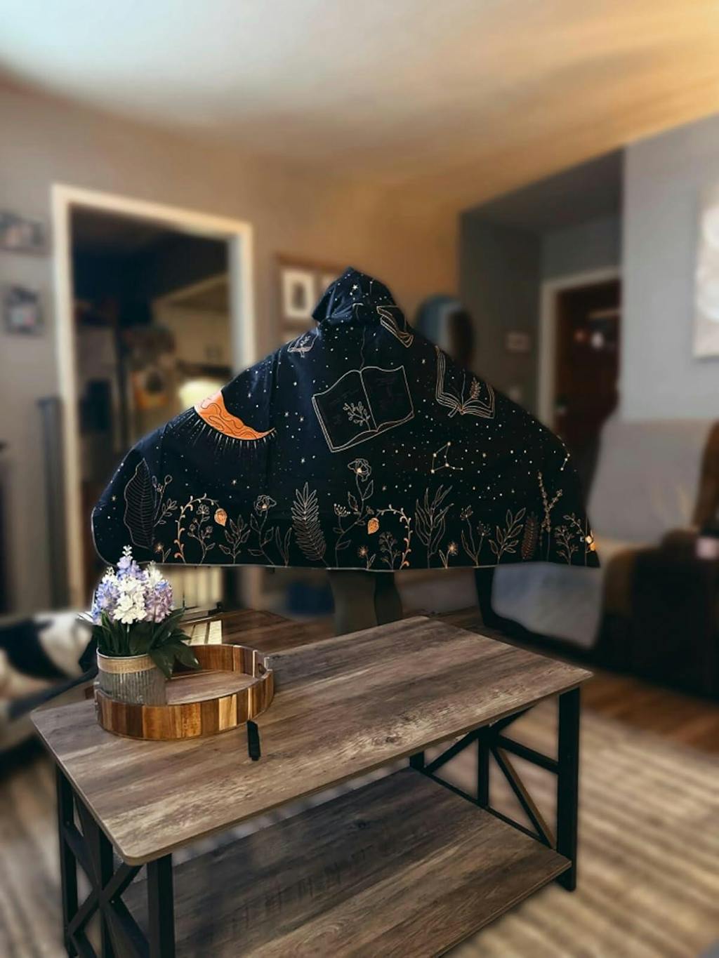 This has to be the cutest and most ingenious purchase I have done. As a book nerd, I sometimes find myself with a normal blanket wrapped around myself and twisting it around my neck as a handsfree cape and this was an all in one hooded blanket cape! The design was beautiful and its so soft and thick material. I was the envy of my family. Customer service was so helpful when my package was delayed during christmas season and resolved the issue with no problem. I will definitely come back and purchase another blanket for myself or as a present.