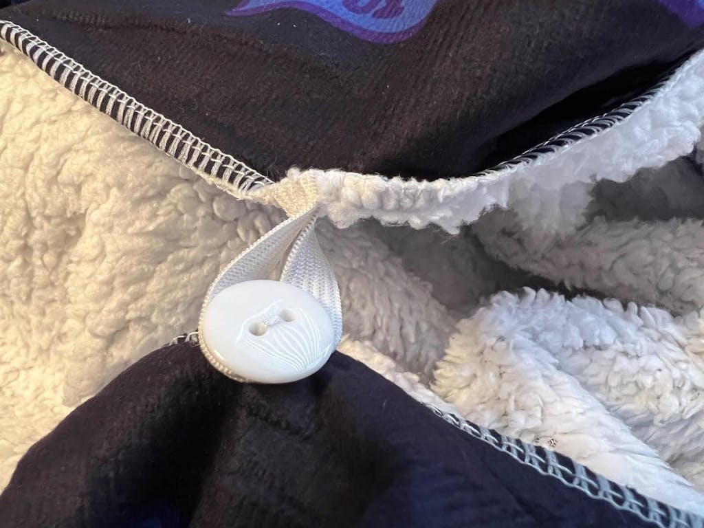 It does fluff out just a little bit more after you wash it. It comes in one of those vacuum sealed storage bags so it was like super squashed down when I pulled it out of the pack. And that little vacuum bag is reusable by the way. Also enclosed in the packaging was a nice little thank you card with a hot chocolate recipe on the back. Haven't tried it yet but it looks tasty. The stitching is pretty good along the edges of the blanket. The little button on it does seem a little bit small and flimsy but it did come with an extra one. The blanket itself is nice and soft on the inside. The outside has a more durable feel to it. Coloring of the print design looks to be nice and rich in color. Should hold up to the washing machine fairly well through a good number of washes before fading. It wrapped around me pretty well and when laid out flat it is big enough to share with someone. Definitely looking forward to a night by the fire pit with this wrapped around me and some smores going. My wife and boys are gonna be jealous. LOL!
