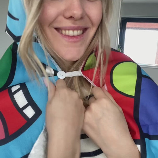 I love the hooded aspect of this blanket. My kiddo hasnt’ gone a single day without it around his shoulders since we got this, period. It’s the first thing he does when he gets home from school—grab the blanket and around the shoulders! It’s soft, and not too heavy. The print is decent quality as well. Washes well, and didn’t have a horrible smell out of the package! Super cute and would be a great car blanket as well!