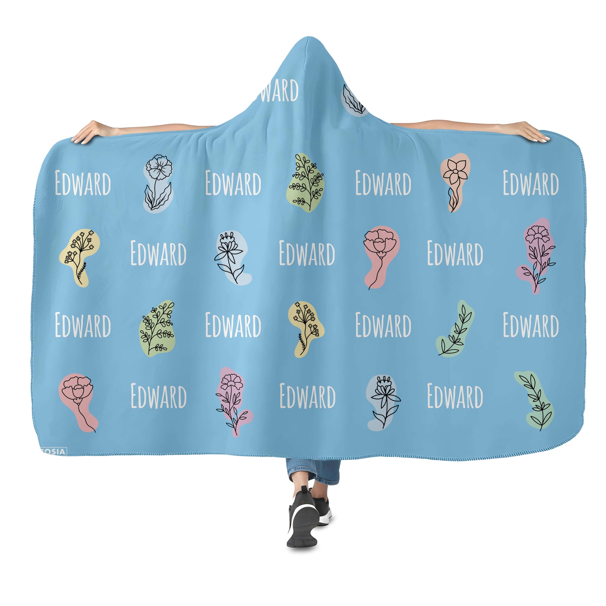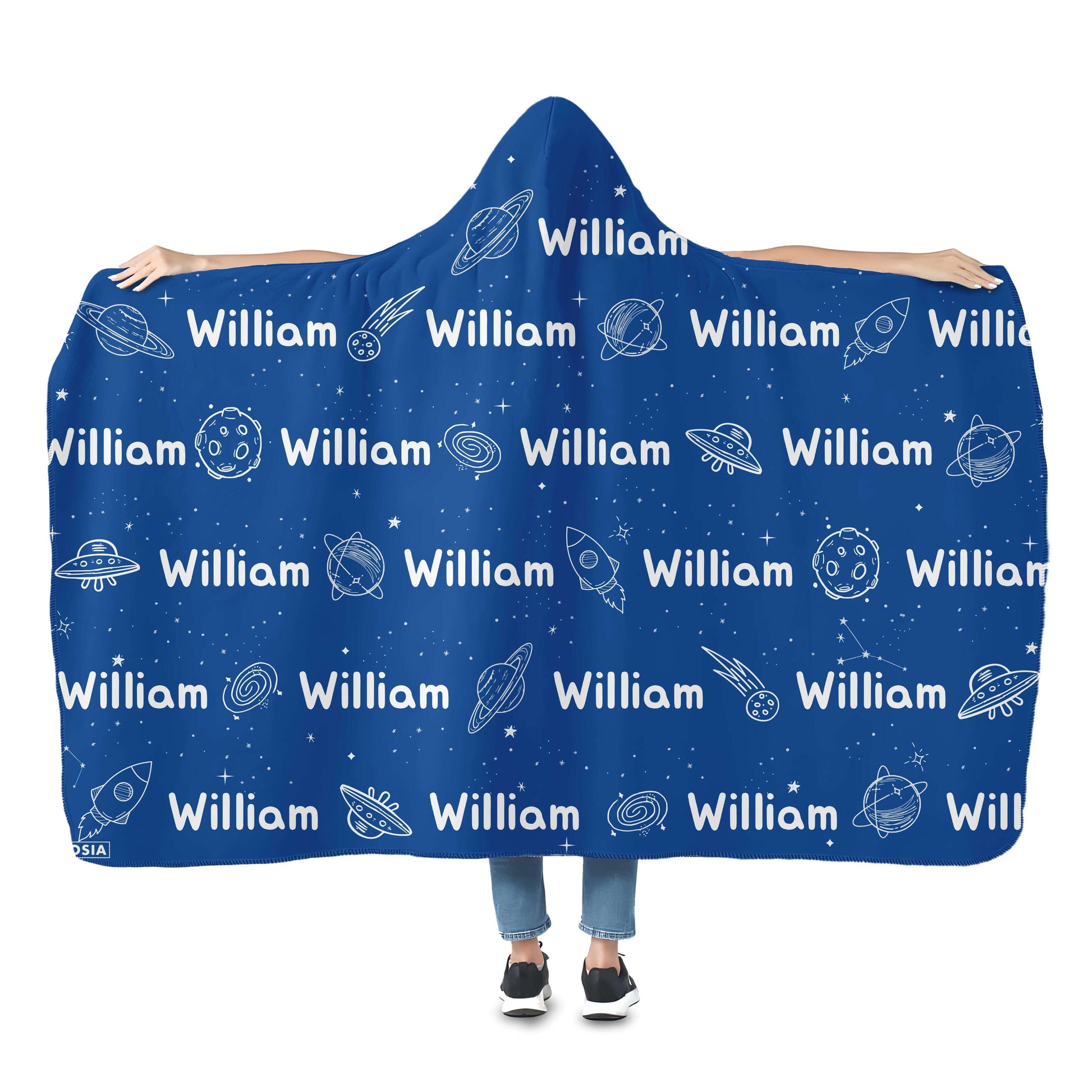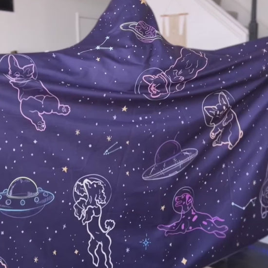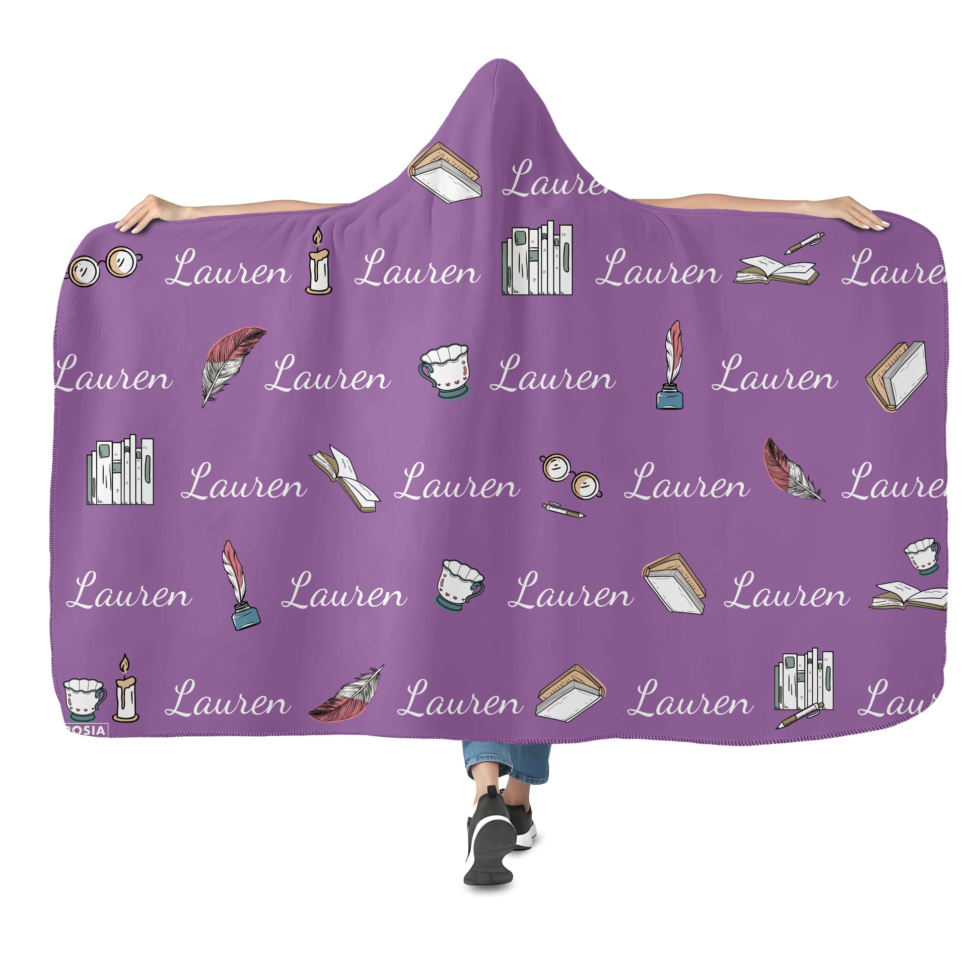 This is a nice hooded blanket that allows you to wear it around like a cloak. It has a button and loop that you use to keep it on. We chose the Dreamer design with the moon and floating books. Love it!