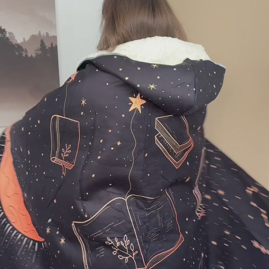 This has to be the cutest and most ingenious purchase I have done. As a book nerd, I sometimes find myself with a normal blanket wrapped around myself and twisting it around my neck as a handsfree cape and this was an all in one hooded blanket cape! The design was beautiful and its so soft and thick material. I was the envy of my family. Customer service was so helpful when my package was delayed during christmas season and resolved the issue with no problem. I will definitely come back and purchase another blanket for myself or as a present.