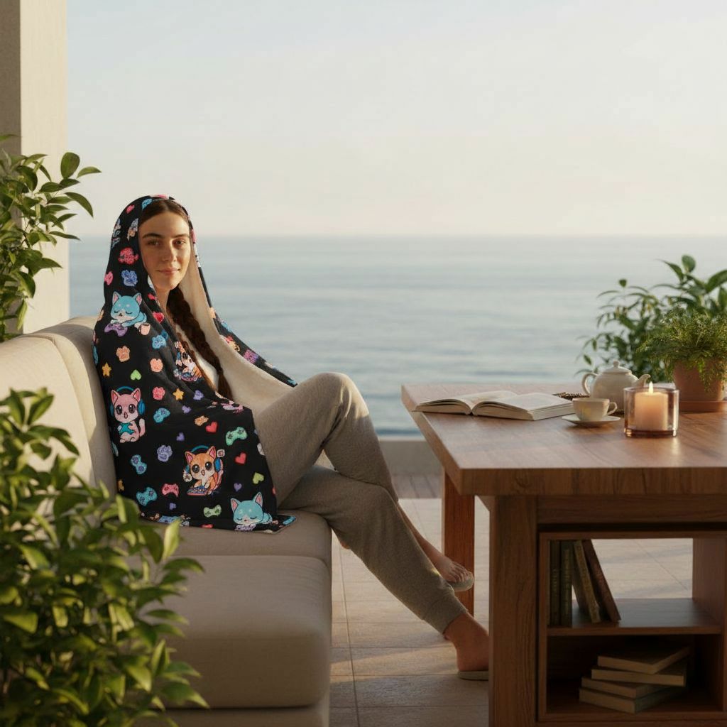 This hooded blanket is really soft and keeps you warm. Good quality and fits all my kids great. Has a bunch of cute cats on it and the inside is like cotton. Very comfortable.